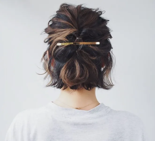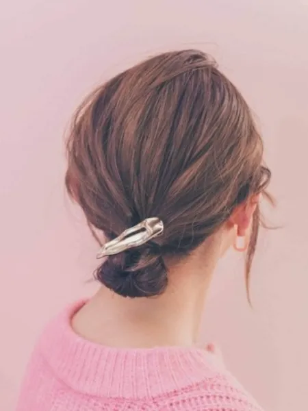 ラフな抜け感がかわいいミディアムの無造作なお団子は、休日コーデの格上げにぴったりなヘアアレンジです。