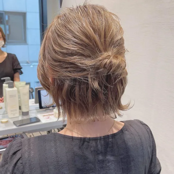 若々しさとかわいさを併せ持つヘアセットにしたいなら、短い髪を小さくまとめるハーフアップがおすすめです。
