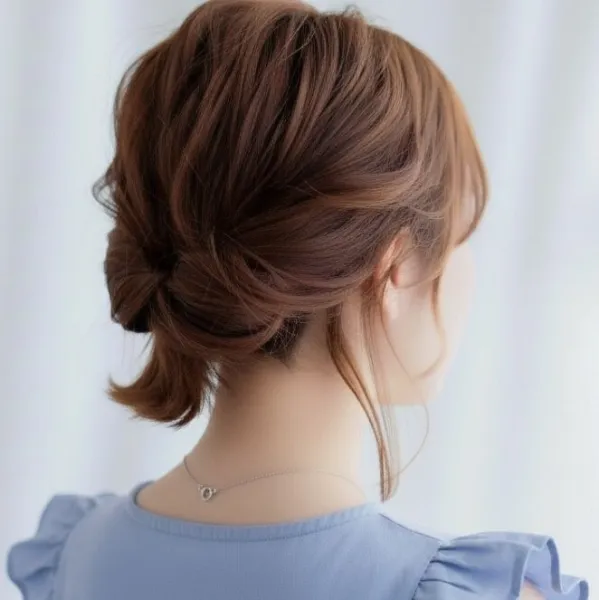 ショートヘアでも、襟足の髪に結べる長さがあればローポニーテールが可能です。低い位置で髪をまとめ、後れ毛を少し出すことでナチュラルな雰囲気のアレンジとなります。