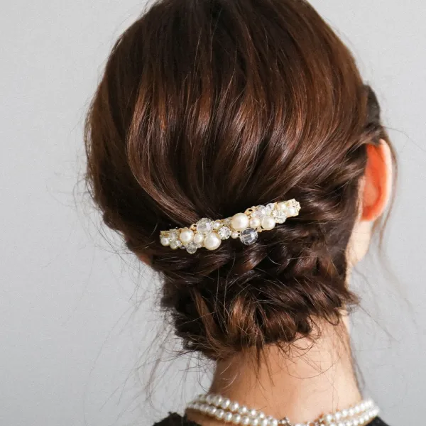 小さなパールのついたバレッタは、派手すぎず上品な輝きで、落ち着いた雰囲気を保ちながらもヘアアレンジに華やかさを添えられます。