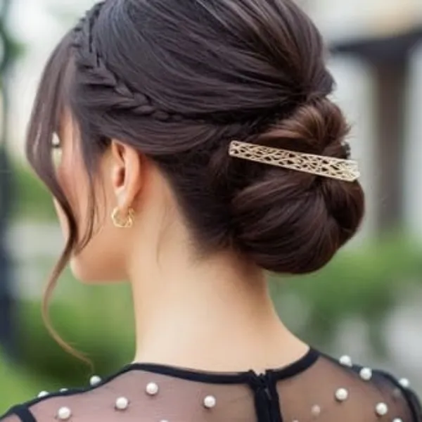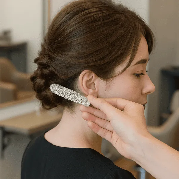 大ぶりで派手なデザインではなく、小さめで繊細なバレッタを選ぶと、華やかさとエレガントさを両立できます。光の加減でさりげなく輝き、写真映えする点も嬉しいポイントです。