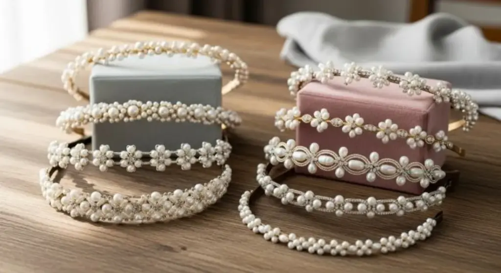パールつきのカチューシャは、上品さと可憐さを両立できる、結婚式にぴったりの髪飾りです。結婚式では、過度に光る装飾や大粒パールが並ぶタイプは避け、控えめな輝きのカチューシャを選んでください。