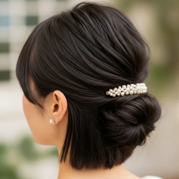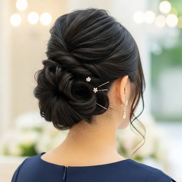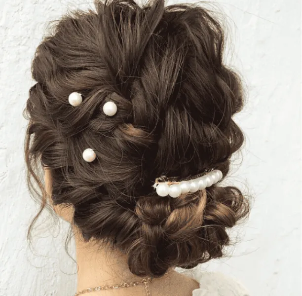 毛束をやさしく引き出しながらまとめることで、柔らかい印象に仕上がります。パールのピンでアレンジすると、より上品な雰囲気を演出できるでしょう。