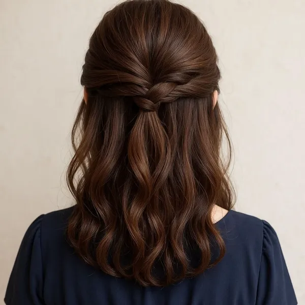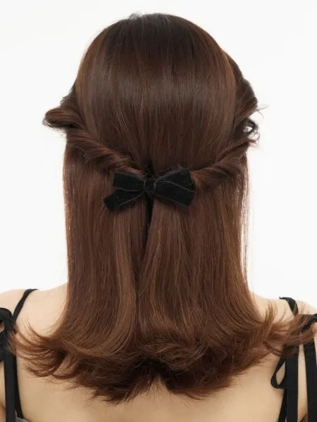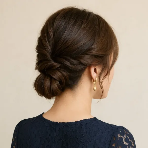 ハーフアップシニヨンは、耳より上の髪を後ろでまとめ、丸めるようにしてお団子を作るスタイルです。首元がスッキリと見え、大人っぽく上品な印象になります。