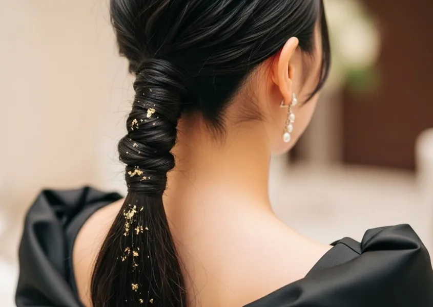 一つ結びにしたあと、毛束を少し取りポニーテールに巻いて結び目を隠すと、デザイン性とおしゃれ感がアップします。金箔をちりばめれば、上品さと華やかさもプラスできます。かわいらしさを加えたい場合は、バレッタで装飾すると良いでしょう。